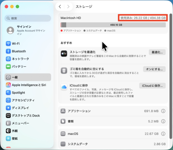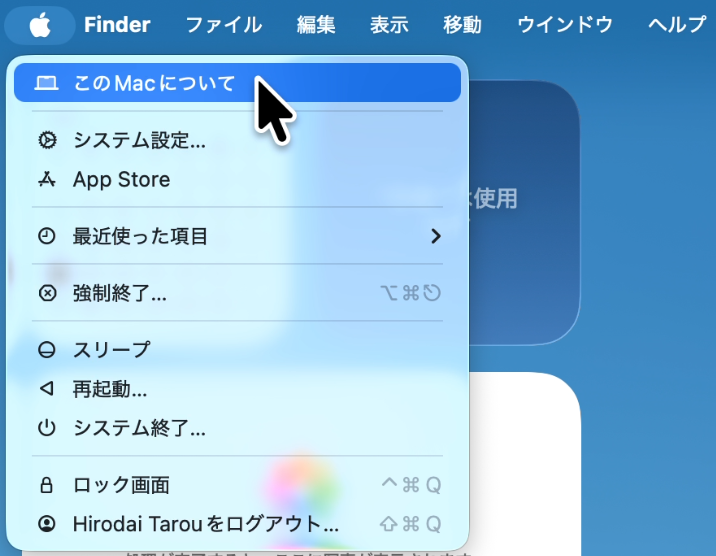 1. 画面左上のAppleマークから「このMacについて」を開きます