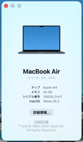 2. 「チップ」「メモリ」「macOSのバージョン番号」を控え、続いて「詳細情報」に進みます