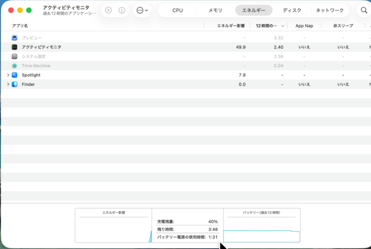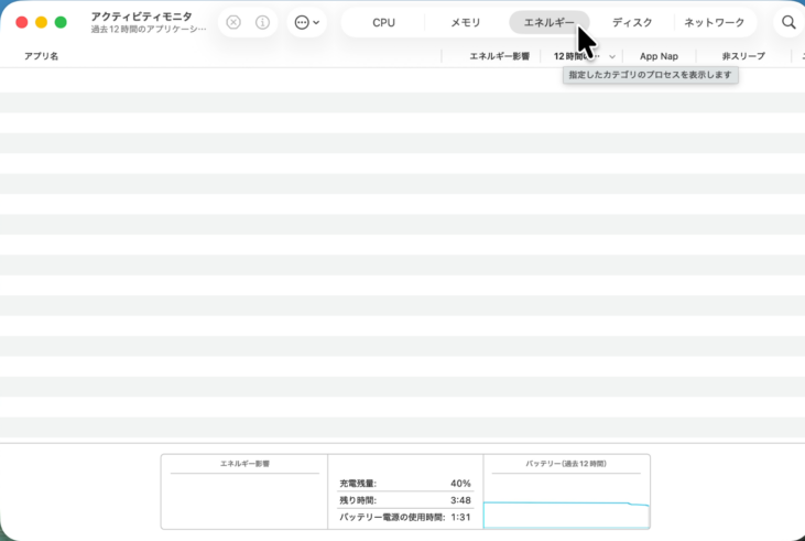 ここではバッテリー関連の情報を見るため、「エネルギー」タブを使います。