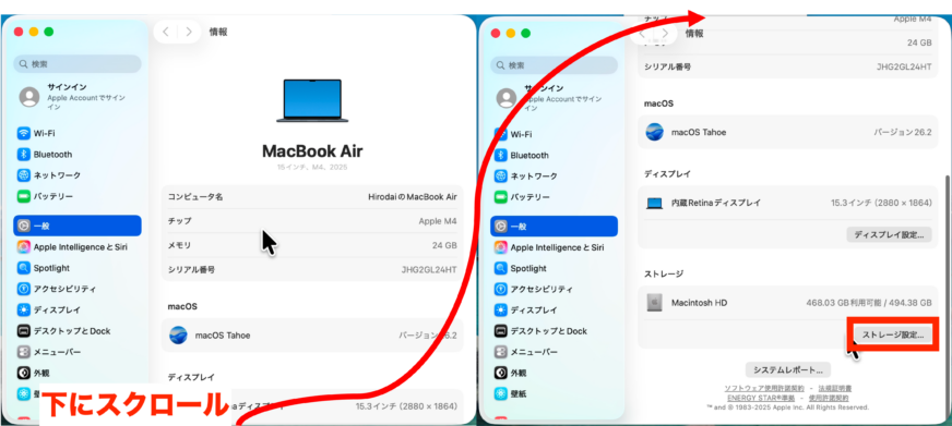 この章では、自分のMacの基本情報(チップ/メモリ/OSバージョン/ストレージ容量)と、バッテリー駆動時間の目安を確認します(学生番号は不要)。ここで控えた情報は、授業中のトラブル対応やサポート窓口への相談時に役立ちます。可能なら画面の写真を撮って残しておきましょう。